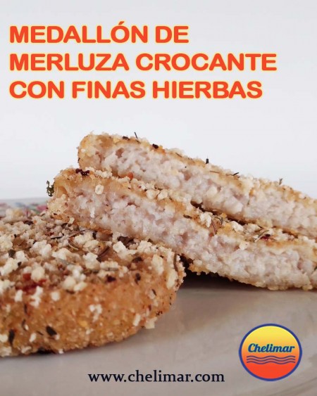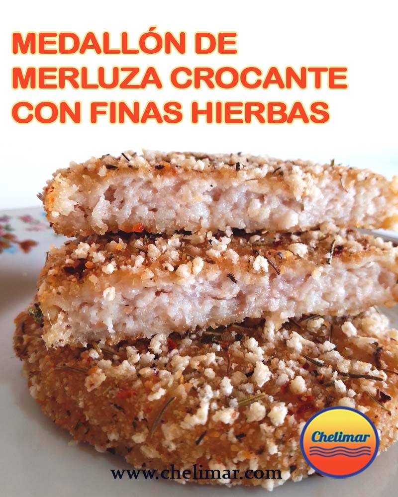 Medallón de merluza con crocante y finas hierbas, envasado, supercongelado.