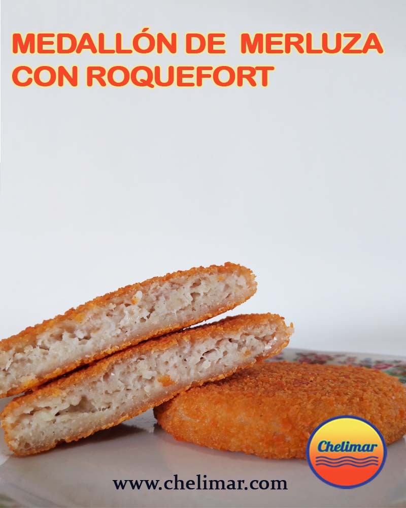 Medallón de merluza con roquefort empanado, prefrito, congelado.